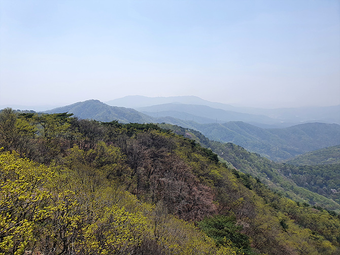 석기봉 가다 잠시 조망 타임. 지나온 길을 돌아 본다. 좌측 연두색 숲 뒤로 솟은 선명한 봉우리가 국사봉. 국사봉에서 우측으로 이어진 능선이 원터마을에서 걸어온 길. 국사봉 우측 뒤(끝) 흐릿하게 광교산과 백운산. 그 앞은 바라산, 우담산 능선.