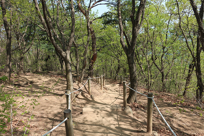 다시 가파른 나무 계단길 오르니 등로엔 화사한 진달래