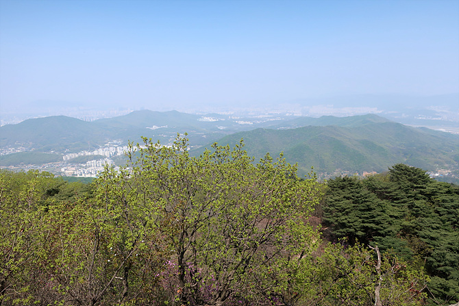 지난 번 구간에 걸었던 광교산과 백운산이 흐릿하게 모습을 드러낸다. 서울대공원 뒤로 매봉(좌)과 우측 관악산. 망경대 암릉에 올라서서 바라보는 시원한 조망이 오늘 산행의 최고 호사일 텐데, 날이 이렇게 흐리니 아쉽게 됐다.